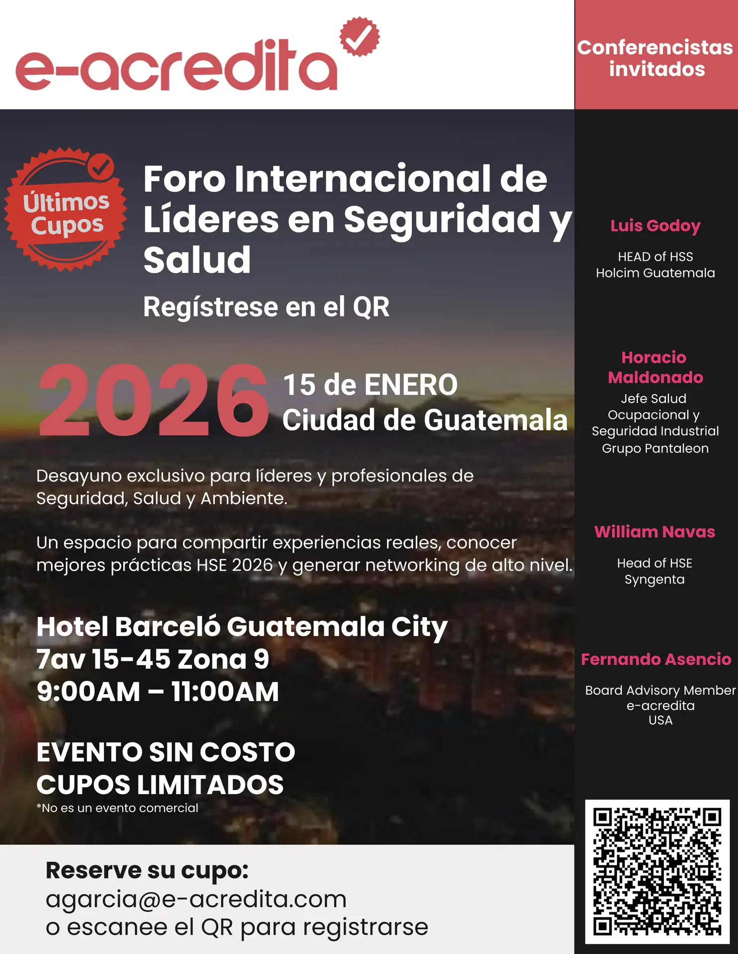El 2026 marcará un punto de inflexión para los sistemas de Gestión de Salud, Seguridad y Medio Ambiente (EHS). Por eso te invitamos a participar en el Foro Internacional en Ciudad Guatemala, registrate y asiste!